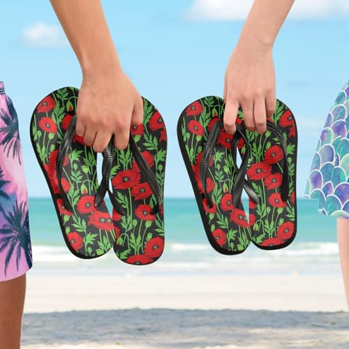 HOT ! Red Flower Leaf Black Flip Flops for Beach Thong Sandals Anti-slip Lightweight Beach Shoes for Summer Outdoor Travel