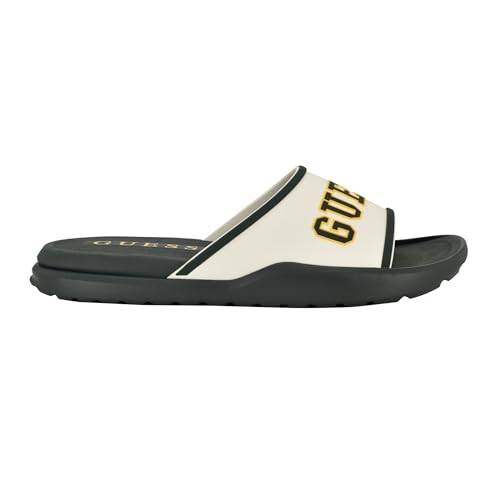 • These casual pool slides sport a molded outsole built for additional comfort and added appeal. Large GUESS branding can be seen across the vamp. Head out in style with these slides. Est. 1981, Guess is a global lifestyle brand and a symbol of a young, adventurous lifestyle.