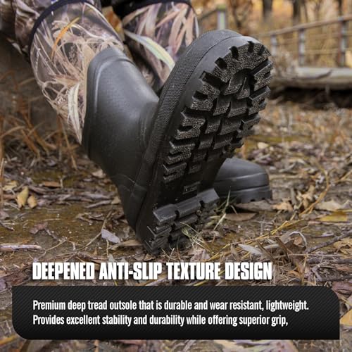 • 【Waterproof & Durable Men's Hunting Boots】Engineered with natural rubber and 6mm neoprene, these men's waterproof boots deliver 100% waterproof protection while maintaining flexibility. The rubber waterproof boots for men feature a one-piece design for shock absorption and heat retention, Whether you need mud boots in wetlands or reliable rain boots in outdoors, these outperform standard hunting gear.