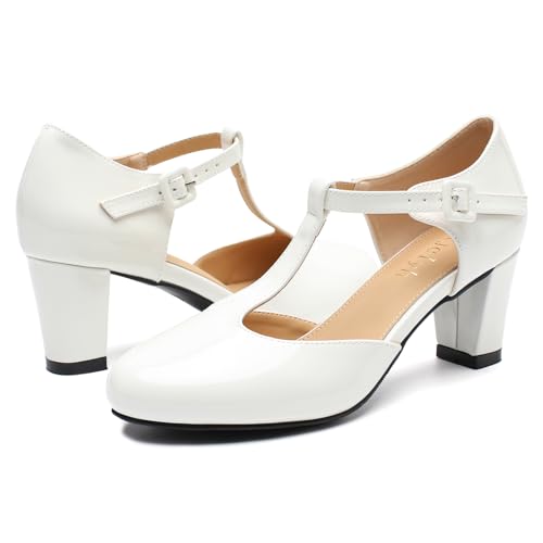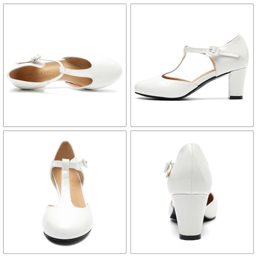 • CLASSIC VINTAGE DESIGN WITH MODERN COMFORT: These women's dress shoes low heel feature a timeless T-strap design, round toe and 2.36" chunky heel, retro heels blending 1920s-1950s style with modern comfort. The padded insole and non-slip rubber outsole white closed toe heels for women ensure all-day wearability. Perfect for wedding shoes for bride, office wear, or casual outings.