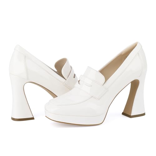 • DESIGN: These fall penny loafer heels have a platform height of 0.7 inches and a chunky tapered heel height of 3.9 inches.Enhance your height and elongate your legs while also helping you feel comfortable walking or standing for long periods of time.The square closed and durable toe gives you plenty of security,easy to put on and off.And the elegant and timeless design of the loafer pumps is the perfect fashion statement to enhance your look.