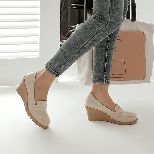 Women's Slip on Round Toe Wedge Pumps,Fashion Hand Stitching Cozy Hiking Platform Loafers Office Work Wedding Party Dress Elegant High Heel Shoes 5