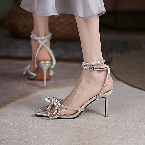 Divanne Women's Double Bow Crystal Wedding Shoes Satin Pointy Pumps Ankle Straps High Heeled Sandals Glitter Party Prom Shoes 5