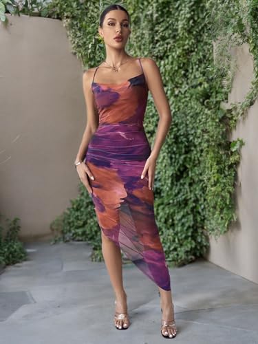 • Feature: Backless, tie dye design, mesh ruched, cami dress, asymmetrical hem with split, club dresses for women, colorful dresses, fashionable and sexy style