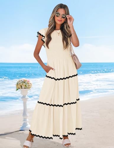 HOT ! ZESICA Women's Summer Flutter Short Sleeve Smocked Midi Dress Casual High Waist Rickrack Tiered Flowy Dresses