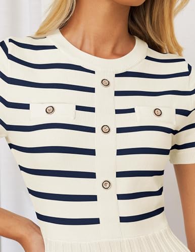 ZESICA Women's 2025 Casual Striped Midi Dress Crewneck Short Sleeve Button Ribbed Knit Swing Pleated A Line Dresses 4