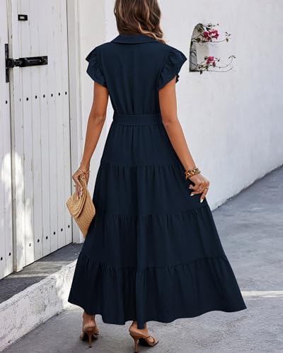 dowerme Women's Summer Casual Dresses 2025 Cap Ruffle Sleeve V Neck Button Belted Tiered Boho Maxi Dress with Pockets 4