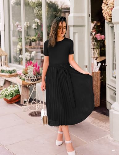 More information about ZESICA Womens 2025 Summer Short Sleeve Midi Dresses Casual Crew Neck Knit Belted Pleated A Line Flowy Wedding Guest Dress