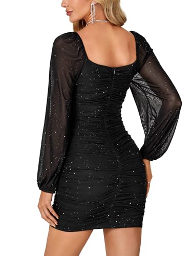 More information about Rooscier Women's Glitter Mesh Long Sleeve Square Neck Ruched Bodycon Party Mini Dress