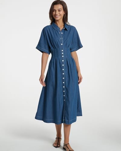 Women's Summer Denim Shirt Dress Lapel V Neck Short Sleeve Midi Jean Dress Button Down Long Dresses 1