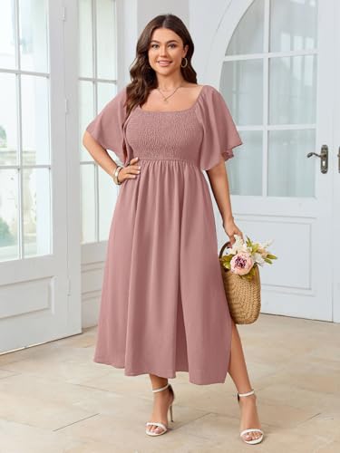 Women's Plus Size Dress Short Sleeve Square Neck Smocked Side Split Flowy A Line Long Maxi Dress 6