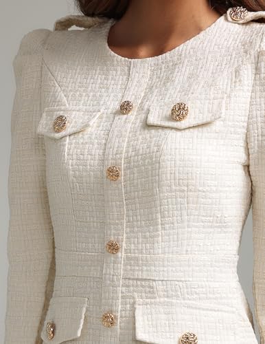 BELLA BARNETT White Tweed Dress Mini Cream Dress for Women Crew Neck Long Sleeve Button Down Dress Tea Party Dress 5