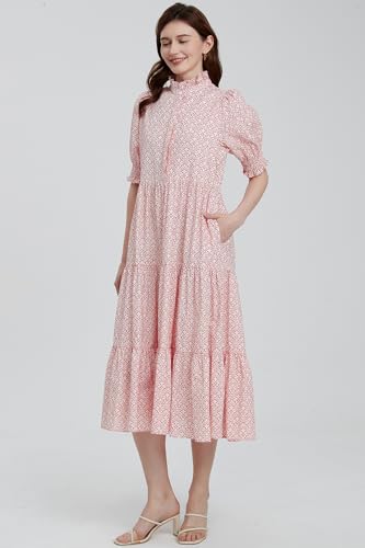 • Feature:Ruffled stand collar,v neck,short puff sleeve with elastic cuffs,button closure,side seam pockets,tiered,maxi length,floral printed