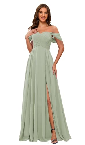 HOT ! Dessiny Women's Off Shoulder Bridesmaid Dresses with Slit Long Ruched Formal Evening Dress with Pockets DE107