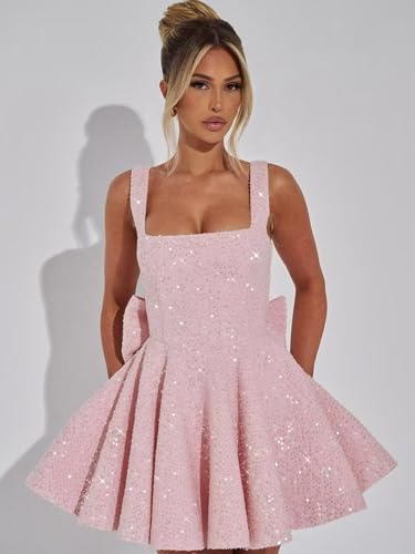 Sparkly Sequin Short Homecoming Dresses for Teens 2025 A Line Square Neck Mini Prom Cocktail Party Gown with Bow 4