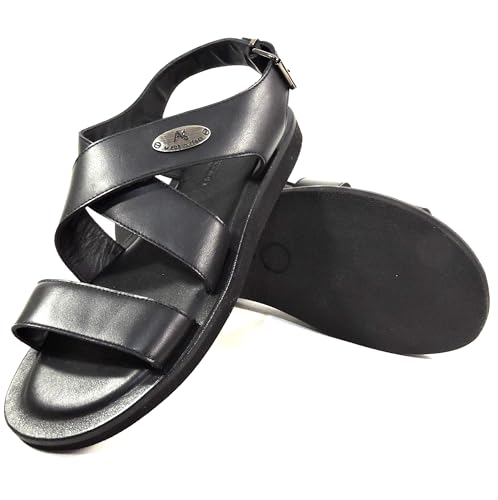 Men's Black Leather Comfort Sandals, Italian Crafted Summer Flat Footwear, Size 42.5 5