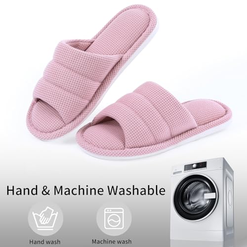 • 𝗘𝘅𝘁𝗿𝗲𝗺𝗲𝗹𝘆 𝗕𝗿𝗲𝗮𝘁𝗵𝗮𝗯𝗹𝗲: Waffle cloth on the footbed and lining allows great breathability, effectively absorbing sweat and preventing odors to keep your feet dry and fresh, making these house slippers an ideal choice for everyday wear.