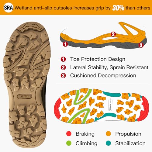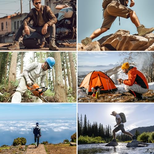 • Multi-Terrain Traction Conquer any terrain with confidence: These work boots for men meet the SRA level of slip resistance standard,The outsole features multi-terrain traction patterns that provide excellent stability and slip resistance on various surfaces, including rocks, mud, and sand. The midsole of these men's hiking boots is reinforced, offering exceptional shock absorption and energy return to reduce fatigue during hiking and work.Removable massage insole is also effective against odor.