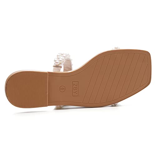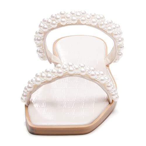 Coutgo Womens Flat Sandals Square Open Toe Pearl Two Strap Slip On Beach Slide Dressy Sandal 5