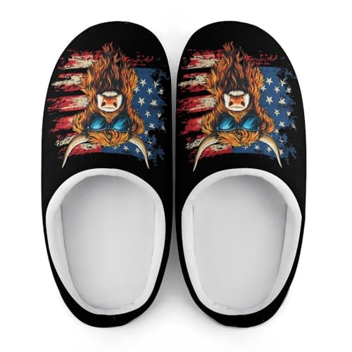 Highland Cow Wearing Glasses U.S. Flag Women's Cotton Slippers Indoor Outdoor Slip-on Warm House Shoes with Anti-Skid Rubber Sole 7