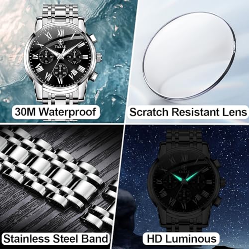 • Fashion Design: A stylish and functional men's wrist watch that combines design and functionality in an effortless way. Our men chronograph watches with retro Roman numerals, chronograph sub-dials and polish stainless steel band. From the dial to the strap, every design element demonstrates Taxau's dedication to fine craftsmanship.