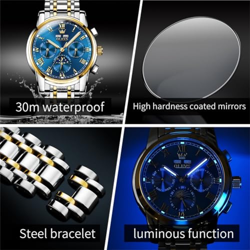 • ⌚OLEVS Luxury Watch for Men: The watches are well designed with 4 calendar functions of year/month/week/day. Classic 6-hand dial design. It is a multifunctional watch to meet the various needs of customers. The classic moon-phase window at the bottom makes it a classic watch for gentleman men.