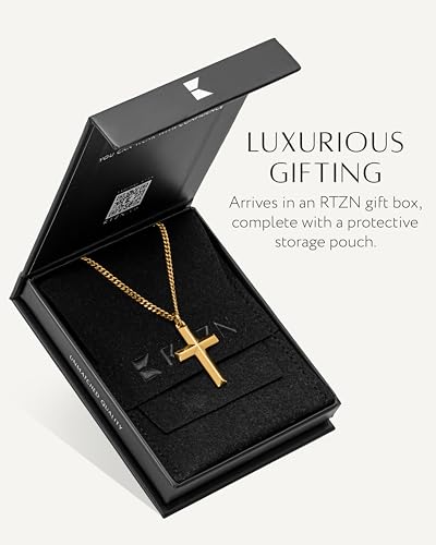 • PREMIUM QUALITY: Experience unmatched craftsmanship with RTZN's gold cross pendant men, crafted with premium 316L stainless steel and enhanced with a rhodium-plated finish for superior durability and will never fade or tarnish! Designed for all-day comfort, this lightweight stainless steel cross necklace is 100% waterproof, sweat-proof, heat-proof, and hypoallergenic, ensuring durability in any condition.