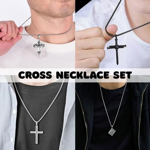 12/24PCS Cross Necklace for Men Silver Chain Jewelry Set Stainless Steel Cross Pendant Goth Necklace for Boys 16-24 inches Chain 5