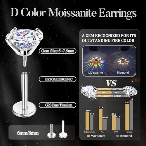 HOT ! Moissanite Earrings G23 Titanium Extended Internal Thread Flat Back Earrings Hypoallergenic Tragus Cartilage Helix Conch Piercing Jewelry for Women Men 18G 6/8mm Post Gray/D Color 0.2-3CT