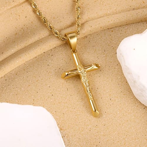HOT ! ALEXCRAFT Sterling Silver Plated Cross Necklace for Men Gold Plated Cross Necklaces for Women Trendy Stainless Steel Crucifix Pendant with 3mm 21inch Rope Chain