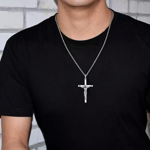 HOT ! FANCIME Crucifix Cross Necklace Polished Crucifix Necklace Sterling Silver Fine Jewelry Gifts for Him Men, Strong Stainless Steel Box Chain Length 24 Inch