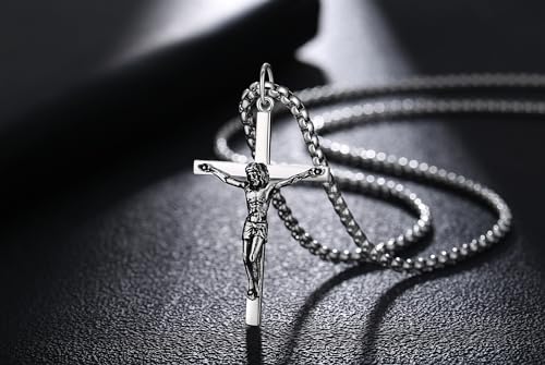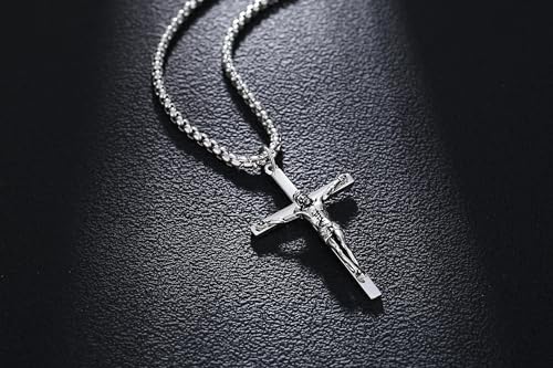 FANCIME Crucifix Cross Necklace Polished Crucifix Necklace Sterling Silver Fine Jewelry Gifts for Him Men, Strong Stainless Steel Box Chain Length 24 Inch 7