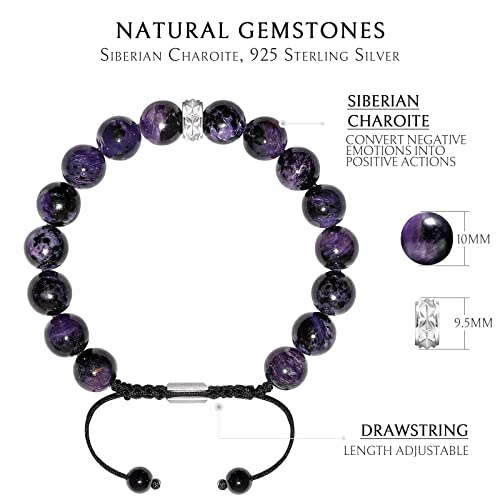 Hawk's Eye Charoite Beaded Bracelet for Men Sterling Silver Charm Adjustable Braided Protection Bracelet (10mm) Natural Gemstones Gift for Men, 6.1''-7.5'' 6