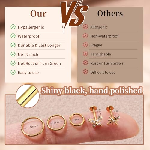 • ✔Each Order Include:10pcs cartilage earrings set.1pc 15mm threadless piercing taper needle,3pcs classic single ring,6pcs flat back earrings.Gold with AAAAA+ CZ top screw.The secure forward-threaded design allows for effortless alignment and quick attachment. With just a slight twist, this titanium conch earring locks firmly in placeFashion enough to match with most of your daily wearing or any other occasion.