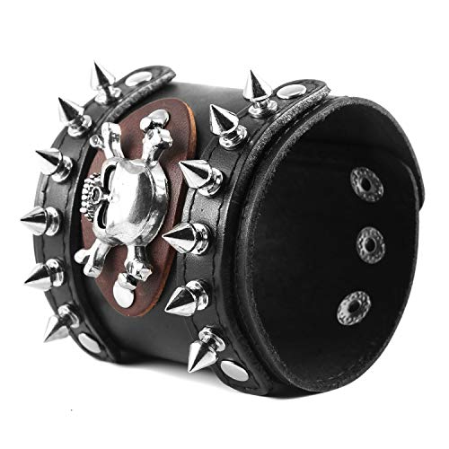 HZMAN Men's Metal Rivet Skull Leather Bracelet Punk Rock Bike Style Wristband Adjustable 6