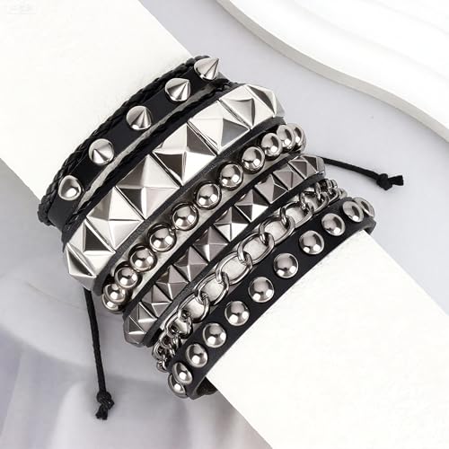 • Premium Material:The set contains four individual rivet bracelets,they are crafted from simulated leather and premium metal. The leather near the wrist is smooth for comfort. The sturdy metal hardware creates a genuine punk look. With wear-resistant artificial leather and colorfast alloy rivets, the bracelet balances comfort and durability.