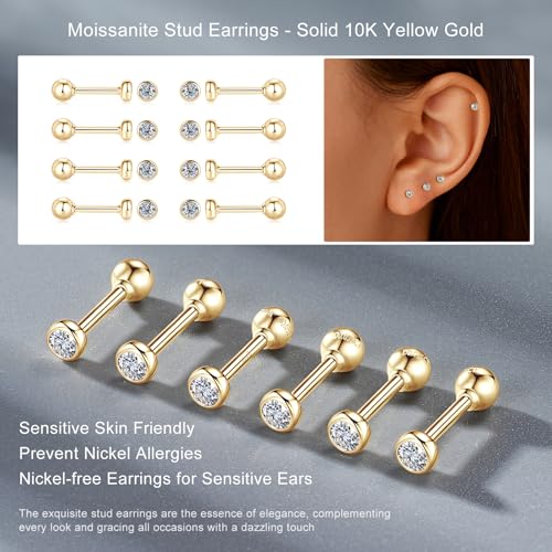 Solid 10K Yellow Gold Ball Stud Earrings, Tiny Moissanite Earrings Real 10K Gold Dainty Screw Ball Back Small Studs Dangle Earring for Womem Men, Cartilage Helix Tragus Piercing Jewelry Gifts, 1 Pair 6