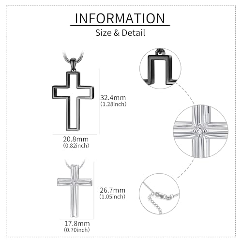 • Hypoallergenic and Durable: Both cross pendants crafted from sterling silver, It is Hypoallergenic, making it suitable for individuals with sensitive skin, while also ensuring durability and longevity. The chain for the women cross necklace is made of sterling silver in 18inch with 2 inch extender. The black chain for the men cross pendant is made of stainless steel in 22inch with 2inch extender. Both chain allows for a customizable fit.