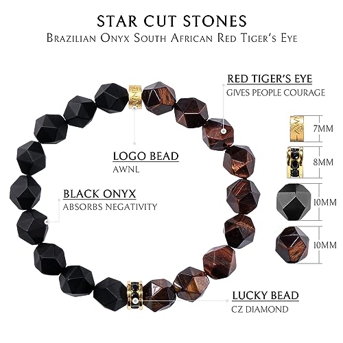 • Precision-Cut Gemstones: This men's bracelet is crafted from 10mm Brazilian Golden Obsidian and Brazilian Black Onyx, carefully selected for their natural beauty and superior quality. Golden Obsidian offers protection against negativity. While the black onyx aids in dispelling negative habits and thoughts. Our natural gemstones exhibit a 60% increase in the longevity and wear resistance compared to similar products