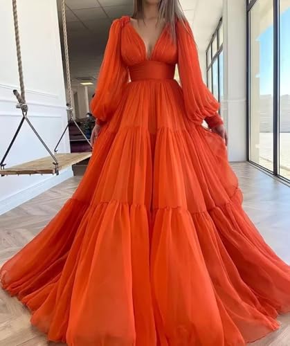 More information about RUISIXANNI Long Sleeve V Neck Tulle Prom Dress Ruffle Puffy Fashion Princess Wedding Dress