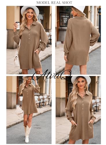 AlvaQ Womens Long Sleeve Dress Loose Button Front Lapel Collared Ribbed Knit Mini Dresses with Pockets 1