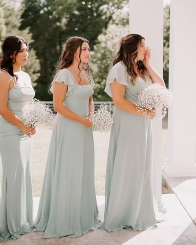 • Features: Square neck chiffon bridesmaid dresses with slit, flutter sleeves evening gowns,short sleeves formal dress for women, a line prom dresses, flutter sleeves,floor length, lace up back, plus size, open back,fully lined