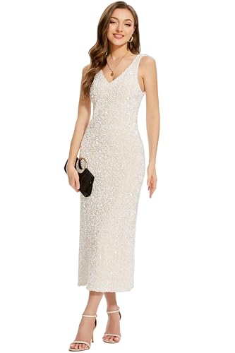 HOT ! OVRUNS Women Sequin Dress Sleeveless V Neck A Line V Back with Liner Sparkly Evening Party Glitter Cocktail Formal Midi Dress