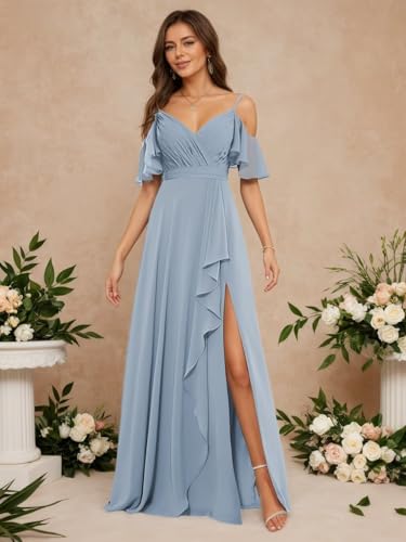 • Features: Cold shoulder bridesmaid dress for women, chiffon formal party dress with slit, v-neck long bridesmaid dress for wedding, ruched spaghetti straps formal evening dress with pocket