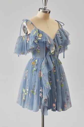 More information about Basgute Flower Embroidery Tulle Short Homecoming Dresses for Teens 2024 Mini Spaghetti Straps Formal Prom Party Gown