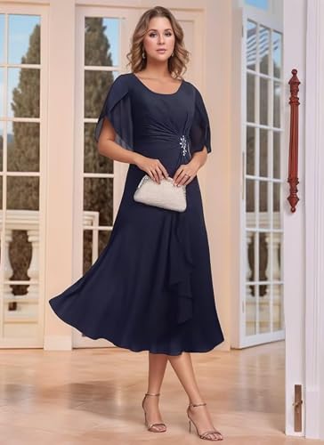 Women's Tea Length Mother of The Bride Dresses Chiffon Ruffles Short Sleeve Formal Dress for Wedding Guest 4