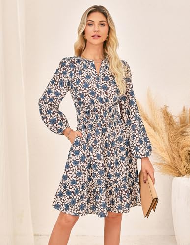 GRACE KARIN 2025 Women's Long Sleeve Henley V-Neck Smocked Waist Floral Mini Tiered A Line Dresses with Pockets 5