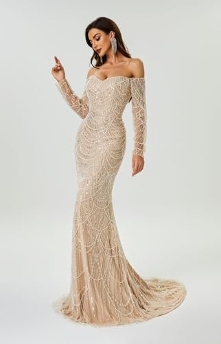 More information about Datangep Luxury Bead Champagne Prom Dresses Off Shoulder Long Sleeves Mermaid Evening Dress Formal Party Gowns