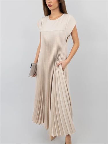 HOT ! KEOMUD Women Summer Pleated Maxi Dress Casual Short Sleeve Crewneck Flowy Swing Long Dress with Pockets