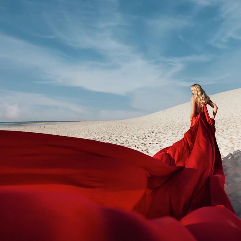 • Stunning Red Gown: This breathtaking floor-length red dress features a flowing skirt that elegantly drapes and moves with each step.